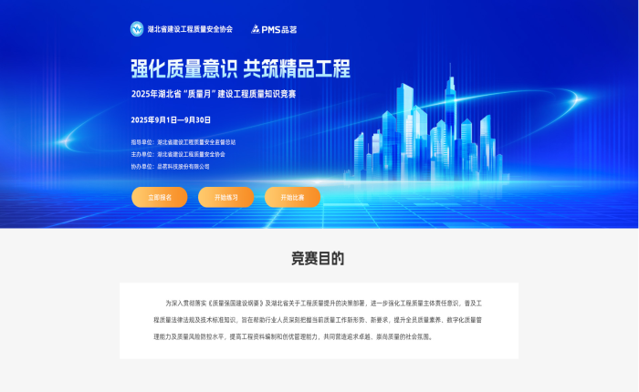 质量是工程的生命线,更是建筑业高质量发展的基石。为深入落实《质量强国建设纲要》,加快培育工程建设领域新质生产力,全面提升从业人员质量意识与专业素养,9月1日至30日,在全国第48个“质量月”活动深入开展之际,由省建设工程质量安全监督总站指导,省建设工程质量安全协会承办的2025年湖北省“质量月”建设工程质量知识竞赛成功举办。
