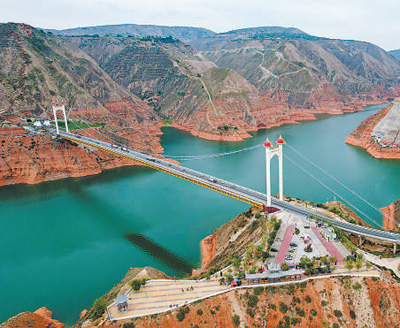 刘家峡大桥位于甘肃省临夏回族自治州东乡族自治县,跨越刘家峡水库黄河支沟,全长568米,是西北地区最大跨度的悬索桥。 曹红祖摄(影像中国) |