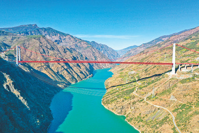 云南省华坪至丽江高速公路全线控制性工程金安金沙江大桥,于2020年底建成通车,主跨1386米,是世界最大跨径山区峡谷悬索桥。 柳小胜摄(人民视觉) |