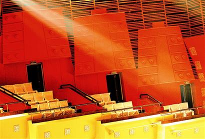 走进剧院大厅,迎面墙壁上一片斑驳的浅红,看上去有木材的纹路。工作人员说:“这是采自埃及的红洞石,每平方米要4000元呢!”细密的孔隙可以感到石头在呼吸。
