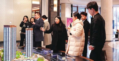 13日中午,记者来到华发外滩玺项目营销中心,大厅内十分热闹,沙盘前围满了咨询的购房者,洽谈区也座无虚席,销售人员忙碌地穿梭其中,有的在为购房者介绍项目信息,有的忙着带客户看房。